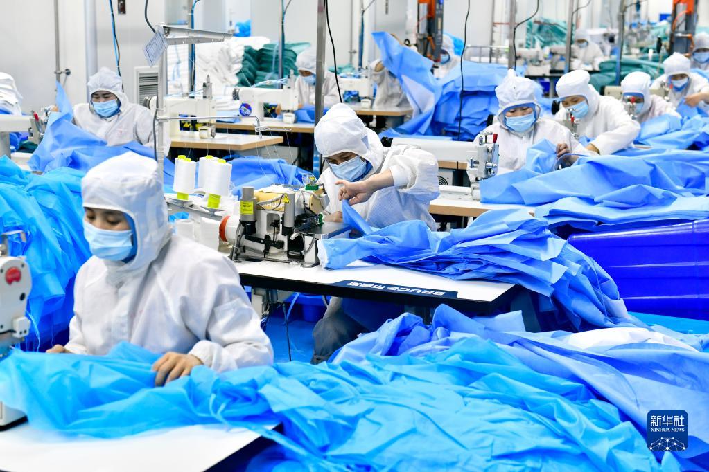 6月7日,在山東康力醫療器械科技有限公司,工作人員在生產(chǎn)防護服。
