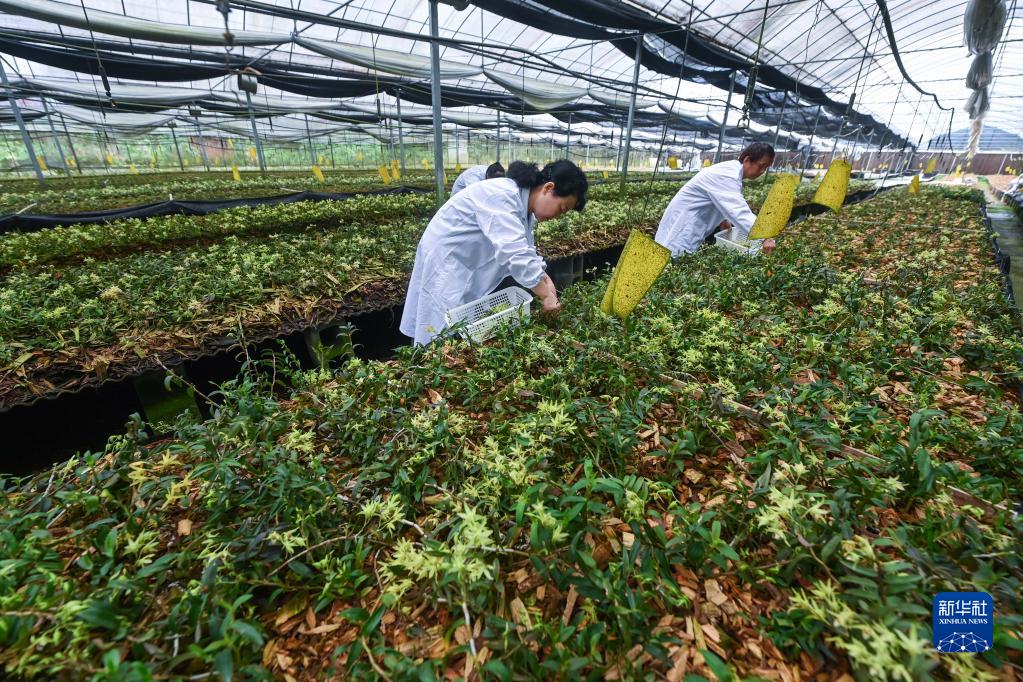 6月8日,種植戶(hù)在諸暨市東白湖鎮的鐵皮石斛有機種植基地采摘鐵皮石斛花和鐵皮石斛鮮條。該鐵皮石斛有機種植基地占地200多畝,是由回歸的鄉賢創(chuàng )辦,該基地除了產(chǎn)出鐵皮石斛鮮條、盆栽以及鐵皮石斛粉、鐵皮石斛酒等多種相關(guān)產(chǎn)品外,還作為當地鄉村旅游的特色景點(diǎn)吸引了上海、杭州、蘇州等省內外游客前來(lái)采購、游玩。