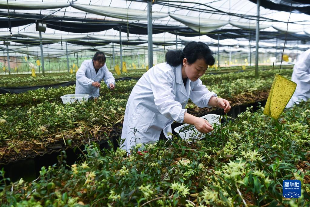 6月8日,種植戶(hù)在諸暨市東白湖鎮的鐵皮石斛有機種植基地采摘鐵皮石斛花和鐵皮石斛鮮條。