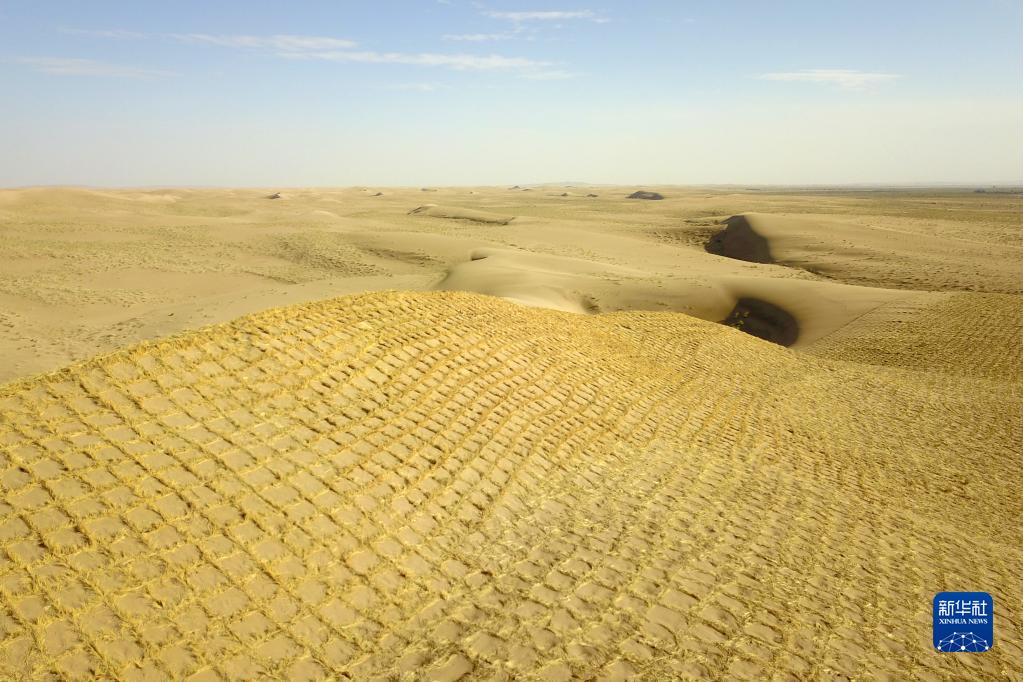 這是5月31日在武威市民勤縣沙咀墩機械壓沙示范區拍攝的草方格沙障(無(wú)人機照片)。