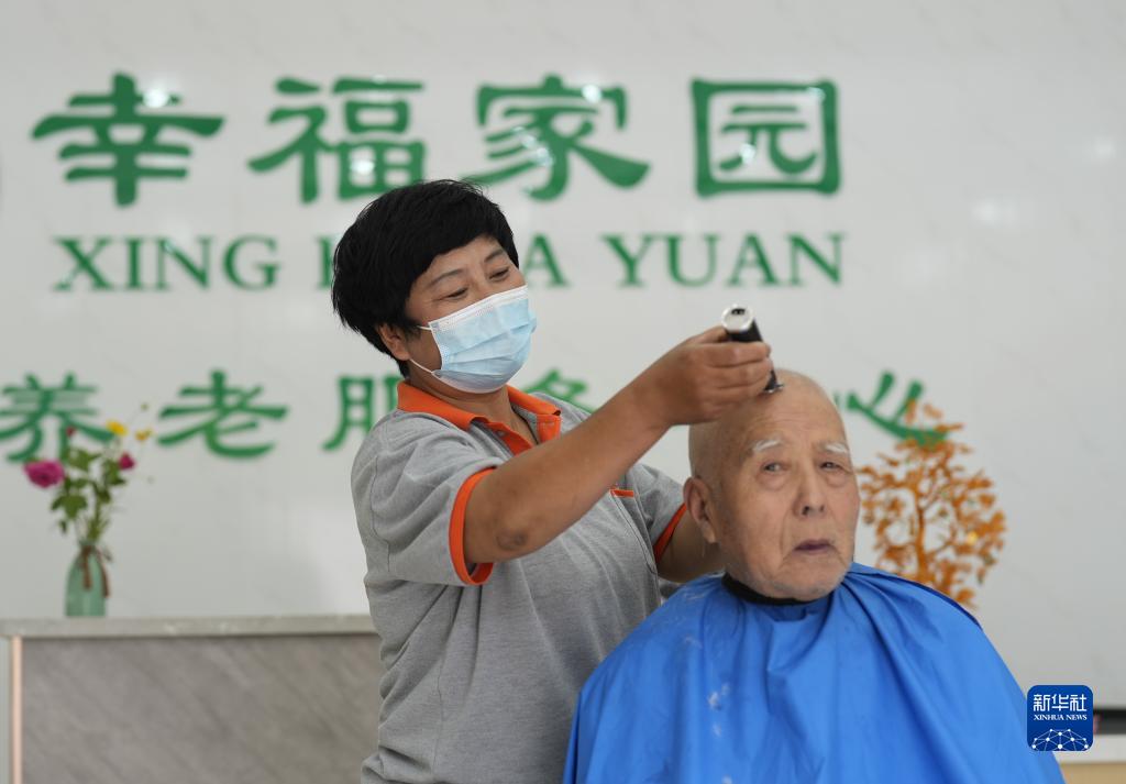 6月8日,河北省灤州市灤城街道東南都會(huì )社區一家社區養老中心的工作人員在給老人理發(fā)。