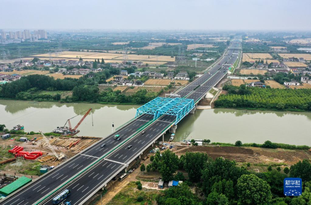 京滬高速公路擴建工程新通揚運河大橋現場(chǎng)(6月6日攝,無(wú)人機照片)。