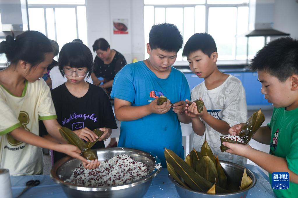 6月8日,學(xué)生們在傳統習俗課上學(xué)習包粽子。