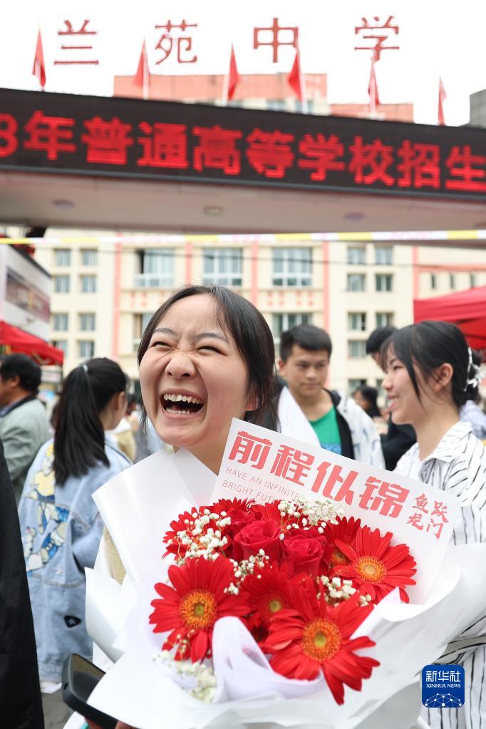 6月8日,在貴州畢節市七星關(guān)區蘭苑中學(xué)考點(diǎn),一名考生手捧家長(cháng)送的鮮花開(kāi)心大笑。