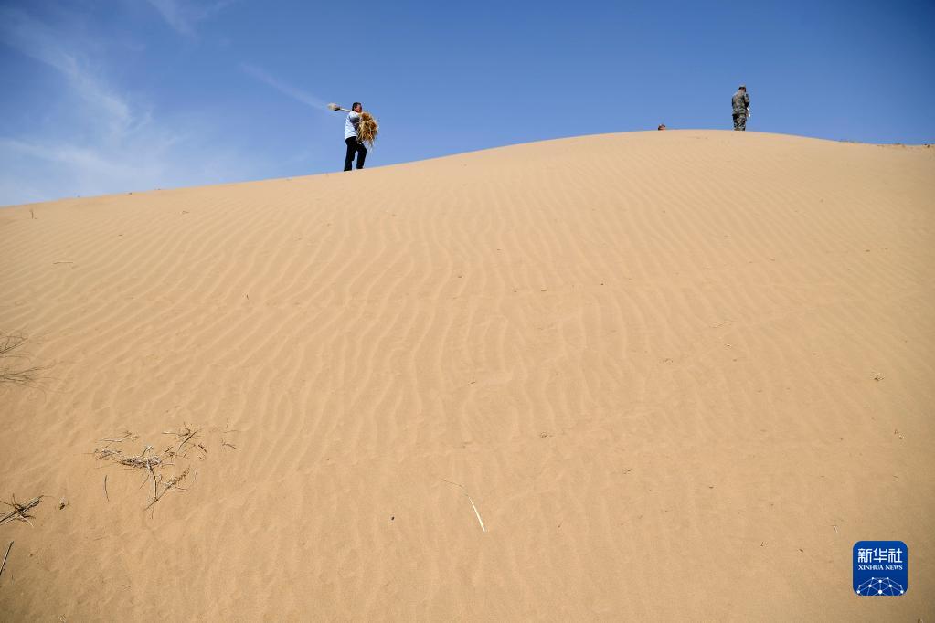 工作人員在白芨灘國家級自然保護區補扎草方格(6月7日攝)。