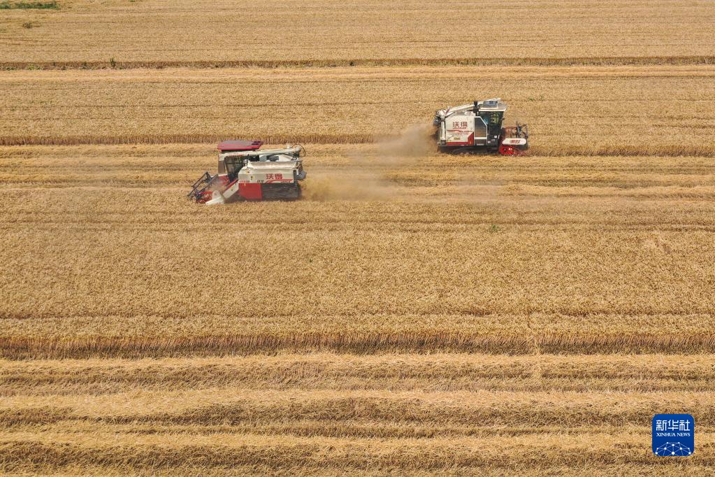6月8日,在江蘇省泗陽(yáng)縣城廂街道卜湖家庭農場(chǎng),農業(yè)機械在田間收割小麥(無(wú)人機照片)。