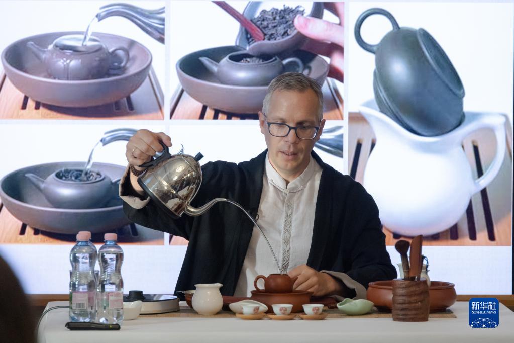 6月1日,在匈牙利布達佩斯,一名茶文化愛(ài)好者在“茶和天下·雅集”活動(dòng)上向嘉賓展示沖泡中國茶。