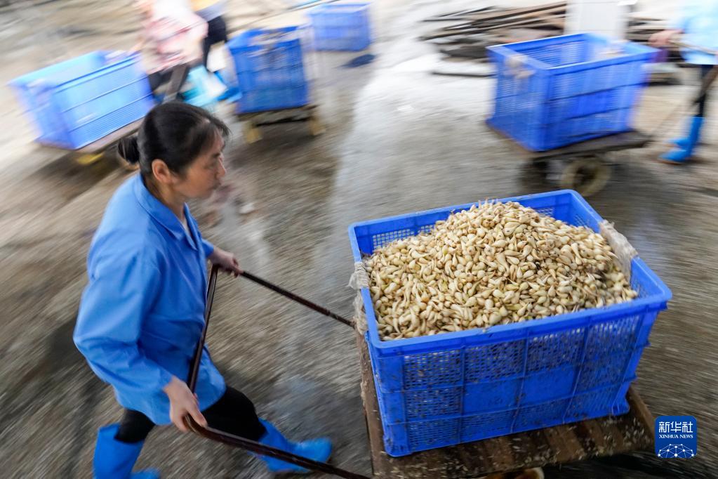 6月8日,在豐都藠頭出口龍頭企業(yè)重慶豐都明富實(shí)業(yè)有限公司的加工車(chē)間,一名工人轉運初洗后的藠頭。