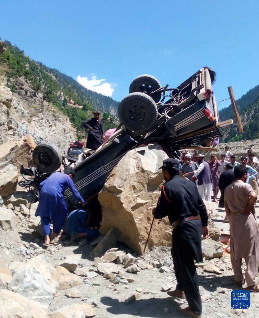 6月8日,在巴基斯坦開(kāi)伯爾-普什圖省的上迪爾地區,人們聚集在墜入峽谷的車(chē)輛周?chē)?/p>