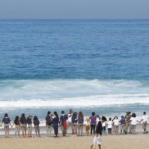 6月8日,在巴西里約熱內盧圣孔拉杜海灘,志愿者手拉手“擁抱”海洋。