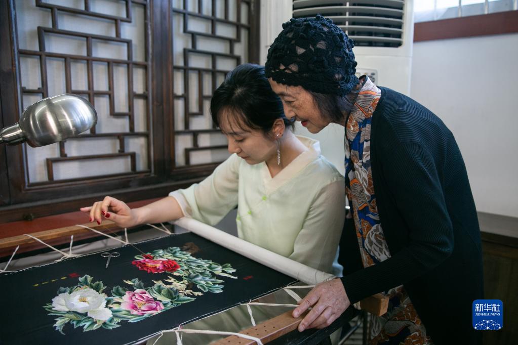 在重慶市渝中區的重慶渝康寧蜀繡藝術(shù)研究院,康寧(右)在指導學(xué)生(5月14日攝)。