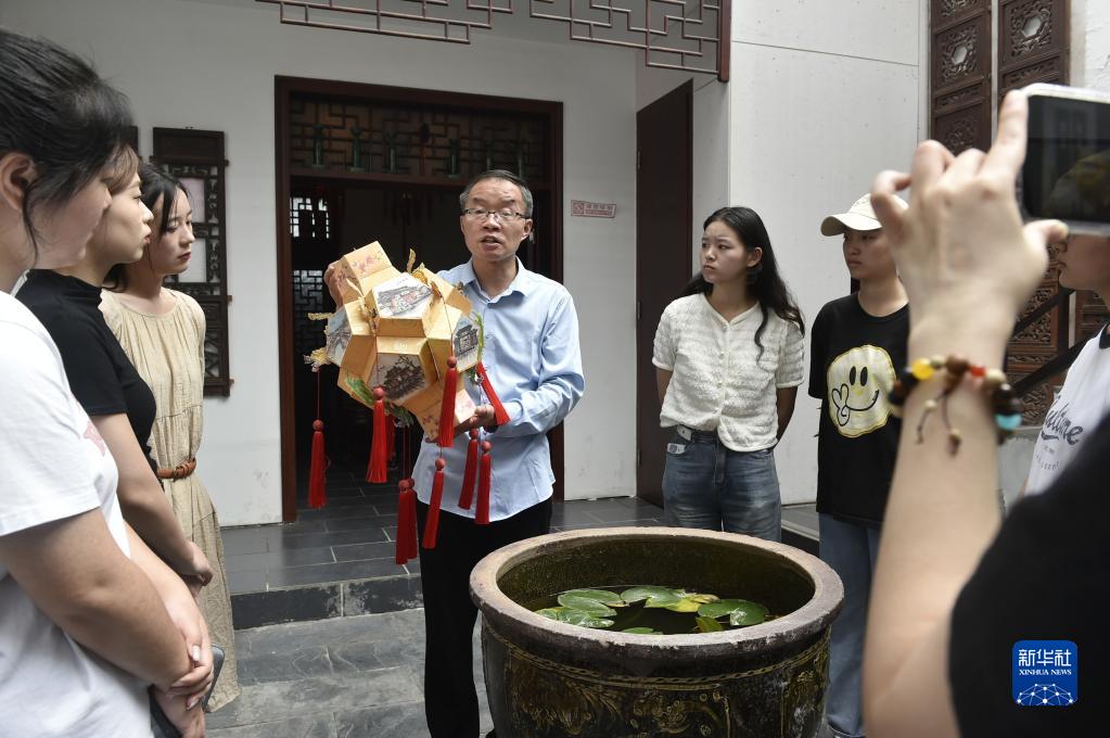 6月7日,張俊濤(中)在開(kāi)封市“汴京燈籠張”彩燈展覽館內向來(lái)訪(fǎng)的大學(xué)生們介紹彩燈制作技藝。