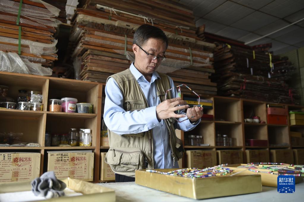 6月7日,張俊濤在工作室內整理制作彩燈的原料。