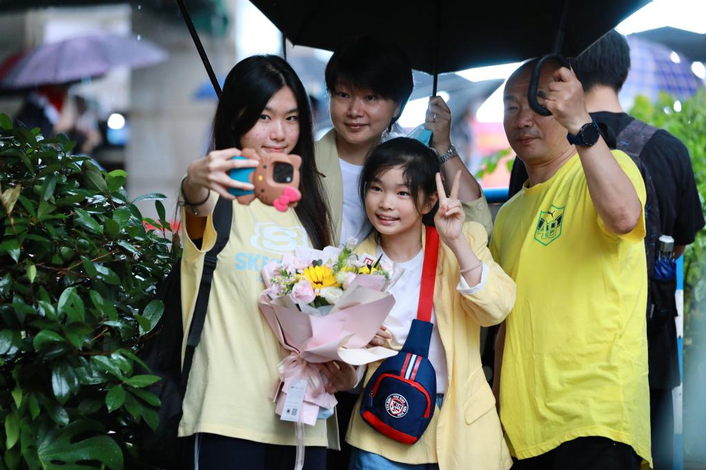 6月9日,在福州第十一中學(xué)考點(diǎn)外,考生(左)在考試結束后與家人合影留念。