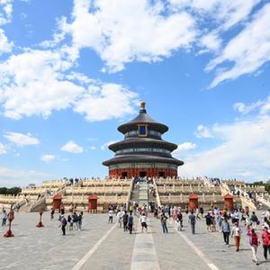6月9日,游客在藍天白云下的天壇祈年殿游覽。