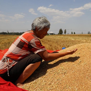 6月9日,在河北省邢臺市廣宗縣東召鄉田家屯村,農民查看剛收獲的小麥。