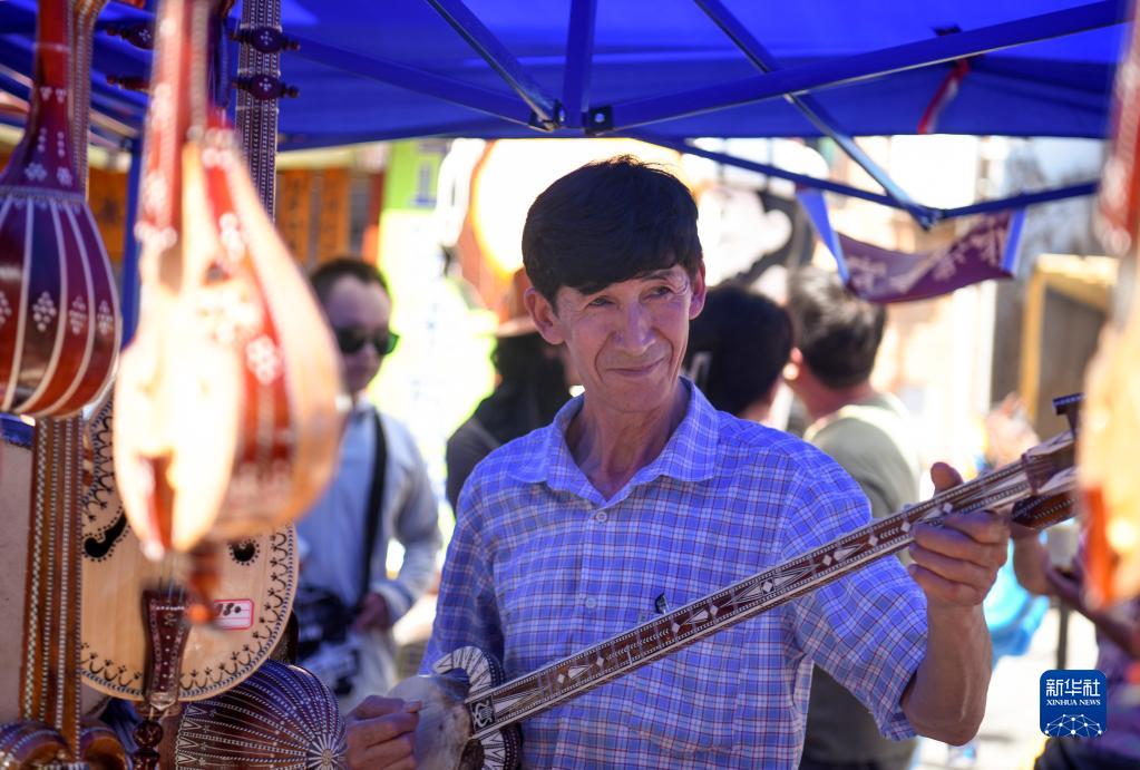 6月9日,在烏魯木齊大巴扎景區,民族樂(lè )器制作傳承人艾爾肯·吐么爾在活動(dòng)現場(chǎng)彈奏熱瓦甫。