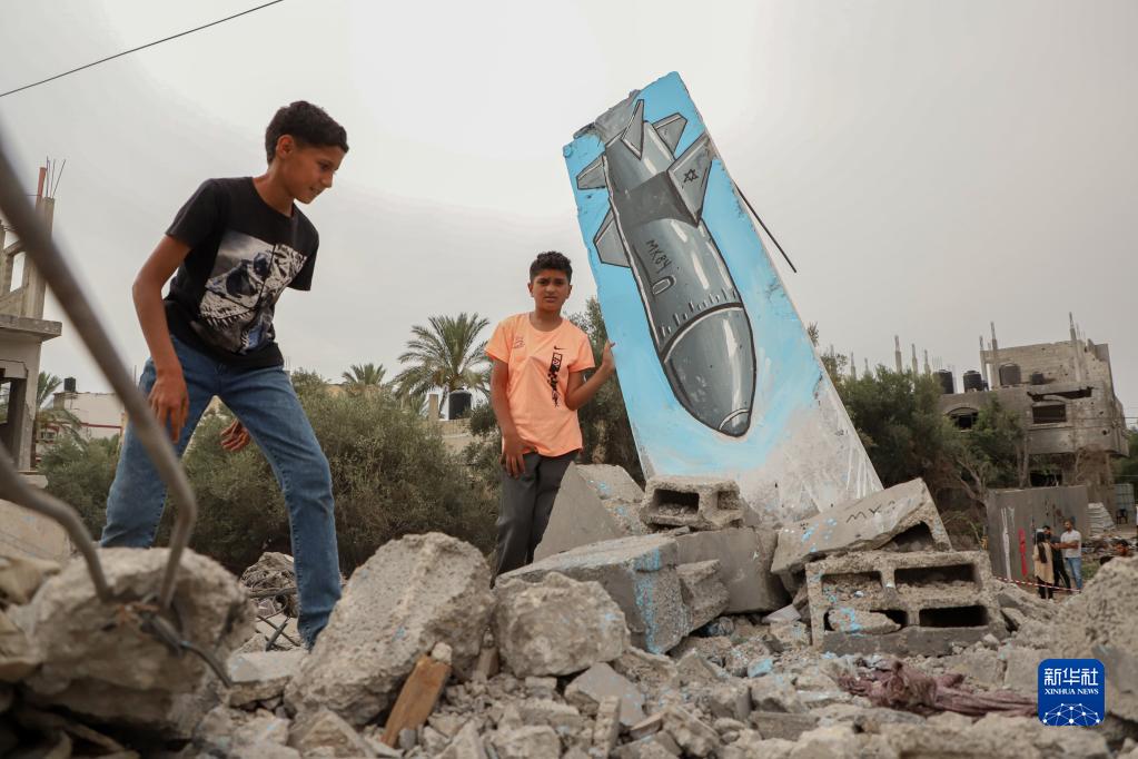 6月8日,兒童在加沙地帶中部一處難民營(yíng)附近畫(huà)有涂鴉的廢墟玩耍。