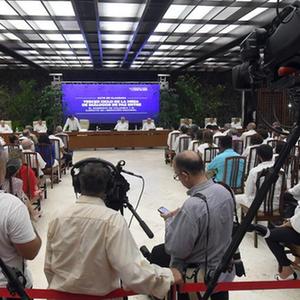 這是6月9日在古巴首都哈瓦那拍攝的哥倫比亞政府與反政府武裝“哥倫比亞民族解放軍”第三輪和談閉幕式現場(chǎng)。