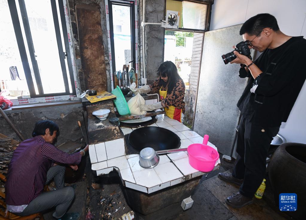 自然造物文化創(chuàng )意團隊的工作人員在浙江省臺州市黃巖區嶼頭鄉布袋坑村拍攝記錄當地百姓制作傳統豆制品,這也是對外推介鄉村農特產(chǎn)品的重要環(huán)節之一(5月30日攝)。