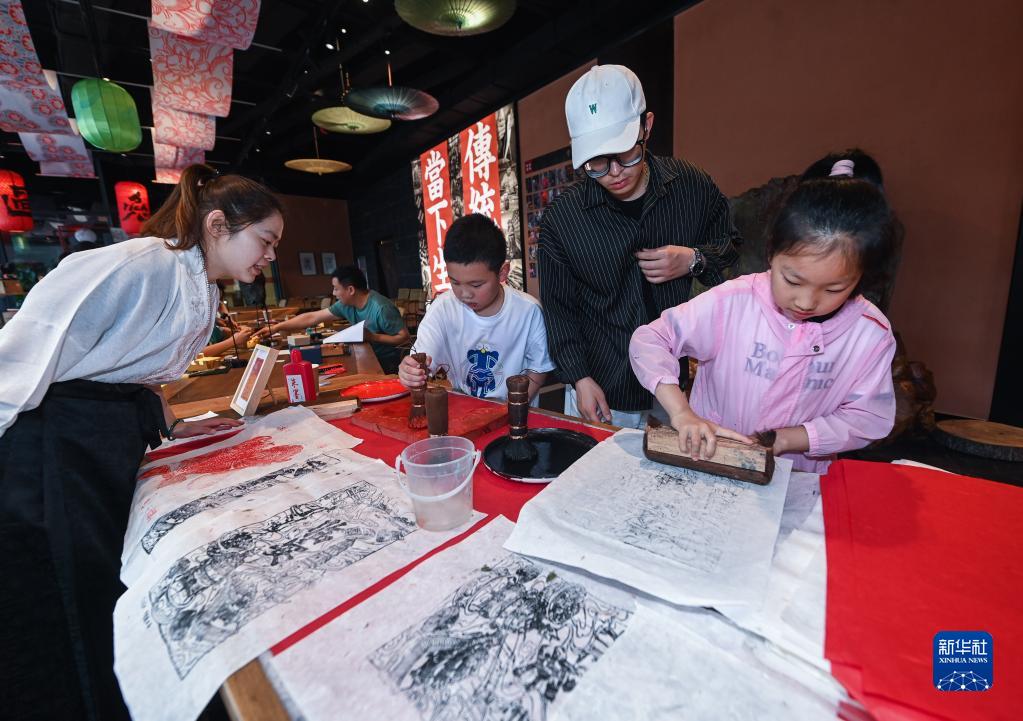 在位于杭州臨安吳越文化公園的“地道吳越”民間手工藝文化空間內,孩子們在老師的帶領(lǐng)下學(xué)習木版年畫(huà)拓印技藝(5月14日攝)。該文化空間集臨安非遺、臨安民藝、文創(chuàng )研學(xué)、休閑體驗為一體,近百件臨安民藝產(chǎn)品在這里匯集。