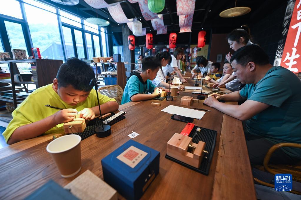 在位于杭州臨安吳越文化公園內的“地道吳越”民間手工藝文化空間內,孩子們在老師的帶領(lǐng)下學(xué)習篆刻技藝(5月14日攝)。該文化空間集臨安非遺、臨安民藝、文創(chuàng )研學(xué)、休閑體驗為一體,近百件臨安民藝產(chǎn)品在這里匯集。