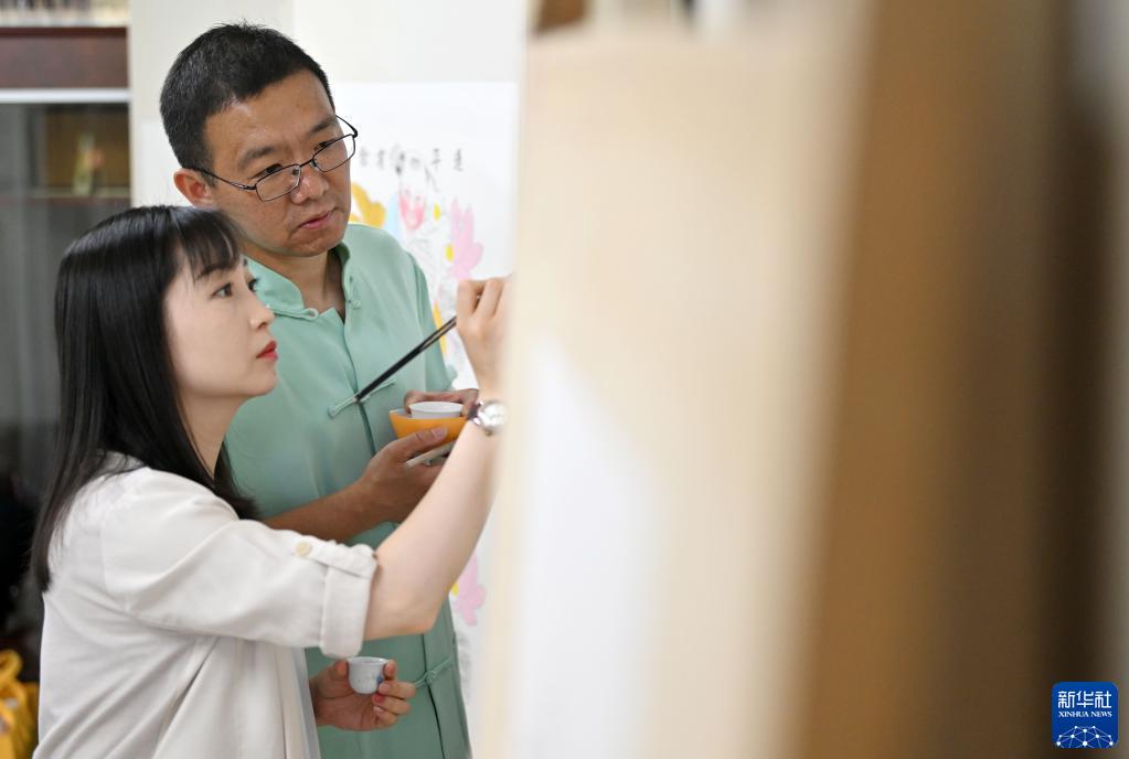 在天津市西青區的楊柳青霍氏古一張畫(huà)店,霍樹(shù)林(右)和妻子王丹一起進(jìn)行彩繪(6月6日攝)。