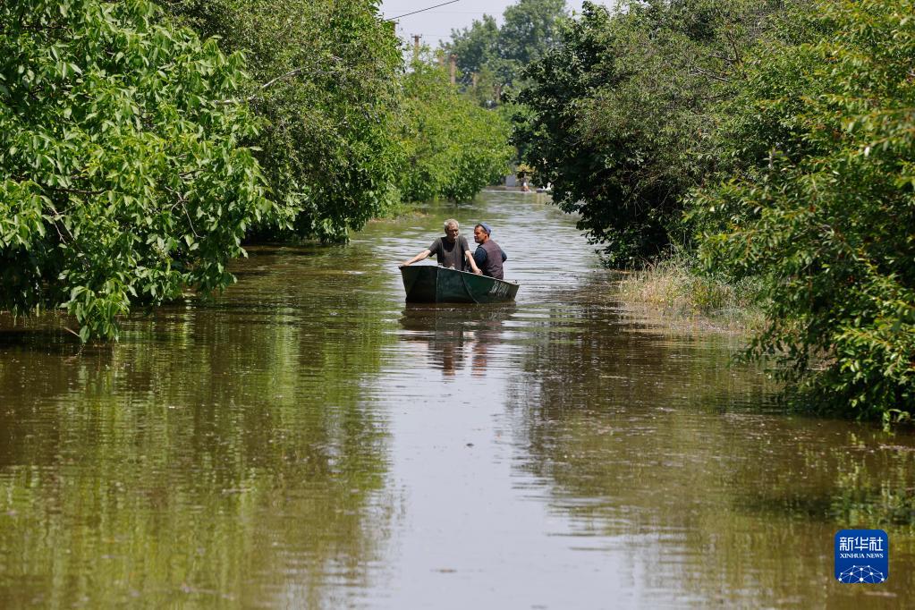 6月8日,人們乘船經(jīng)過(guò)赫爾松州被洪水淹沒(méi)的地區。