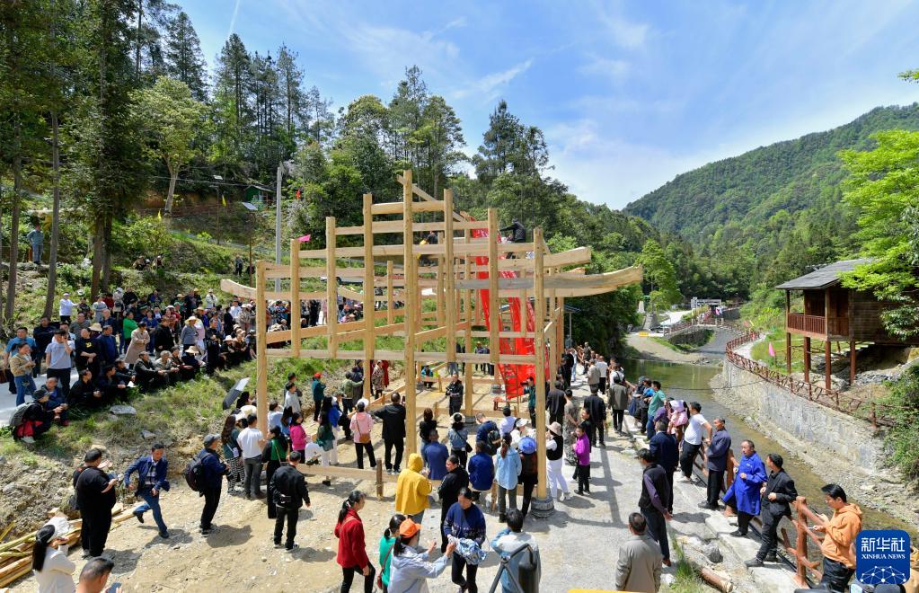 4月26日,在湖北省宣恩縣沙道溝鎮老岔村,村民在舉行吊腳樓落成儀式。