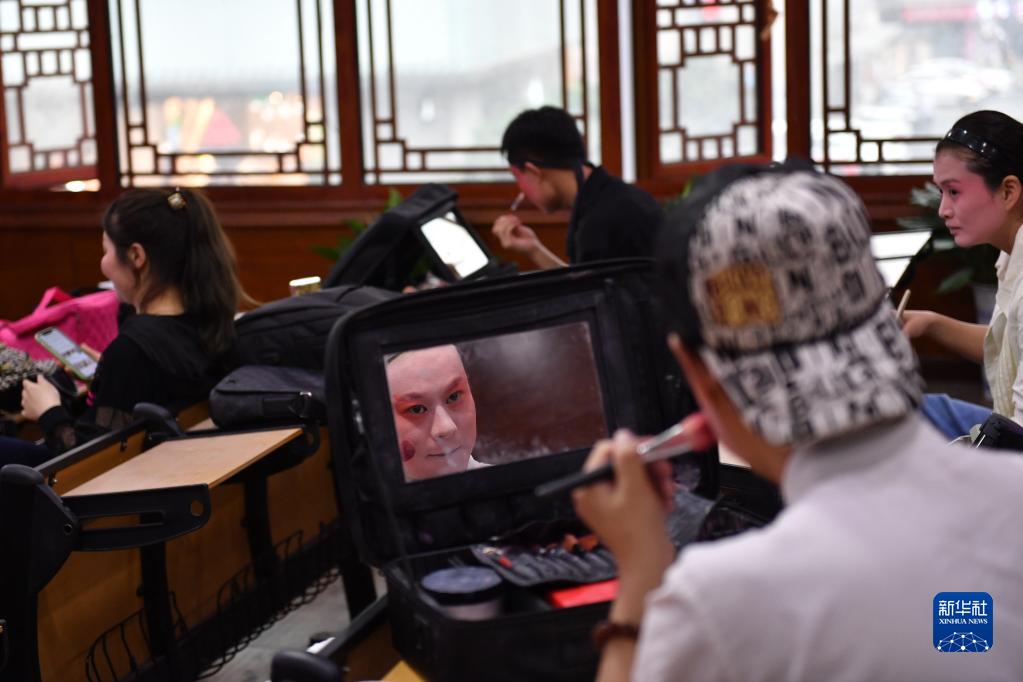 6月5日,在長(cháng)沙市坡子街火宮殿,長(cháng)沙市花鼓戲保護傳承中心的演員在演出前化妝。