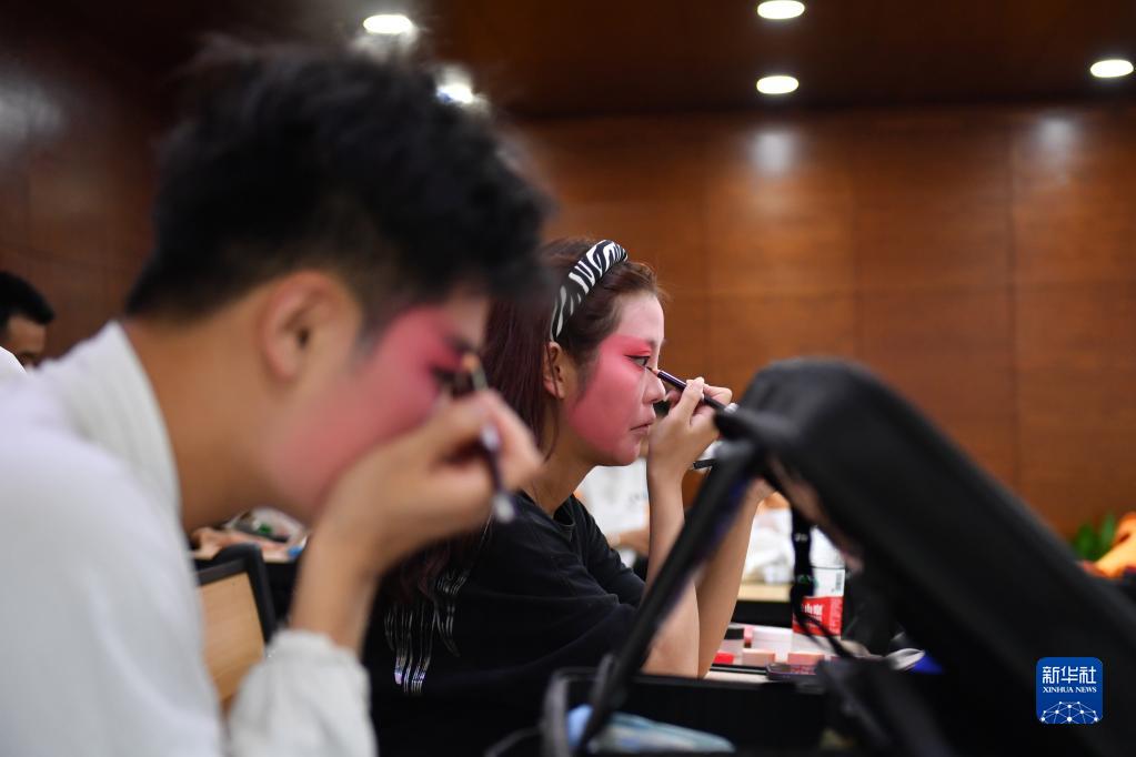 6月5日,在長(cháng)沙市坡子街火宮殿,長(cháng)沙市花鼓戲保護傳承中心的演員在演出前化妝。