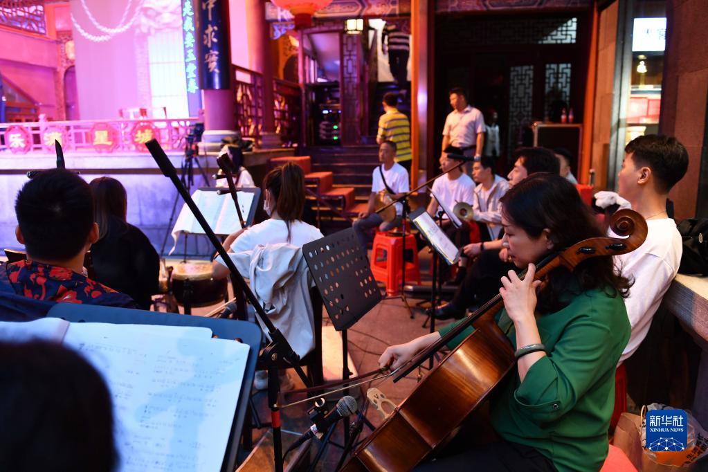 6月5日,長(cháng)沙市花鼓戲保護傳承中心樂(lè )隊在長(cháng)沙市坡子街火宮殿演出。