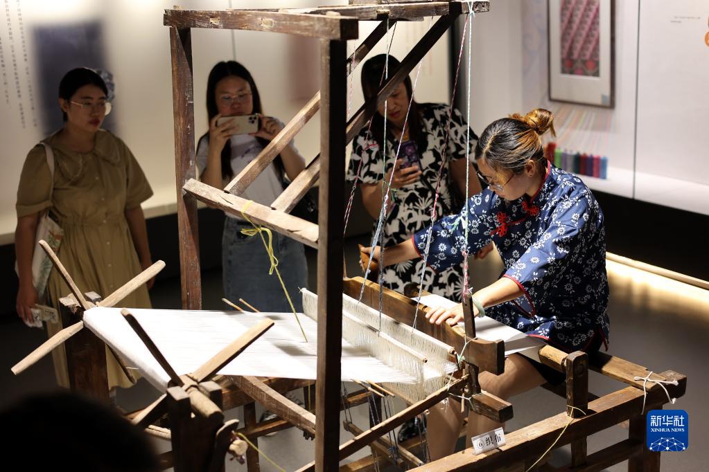 6月10日,在山東省濱州市博物館,非遺傳承人向參觀(guān)者展示傳統織布技藝。