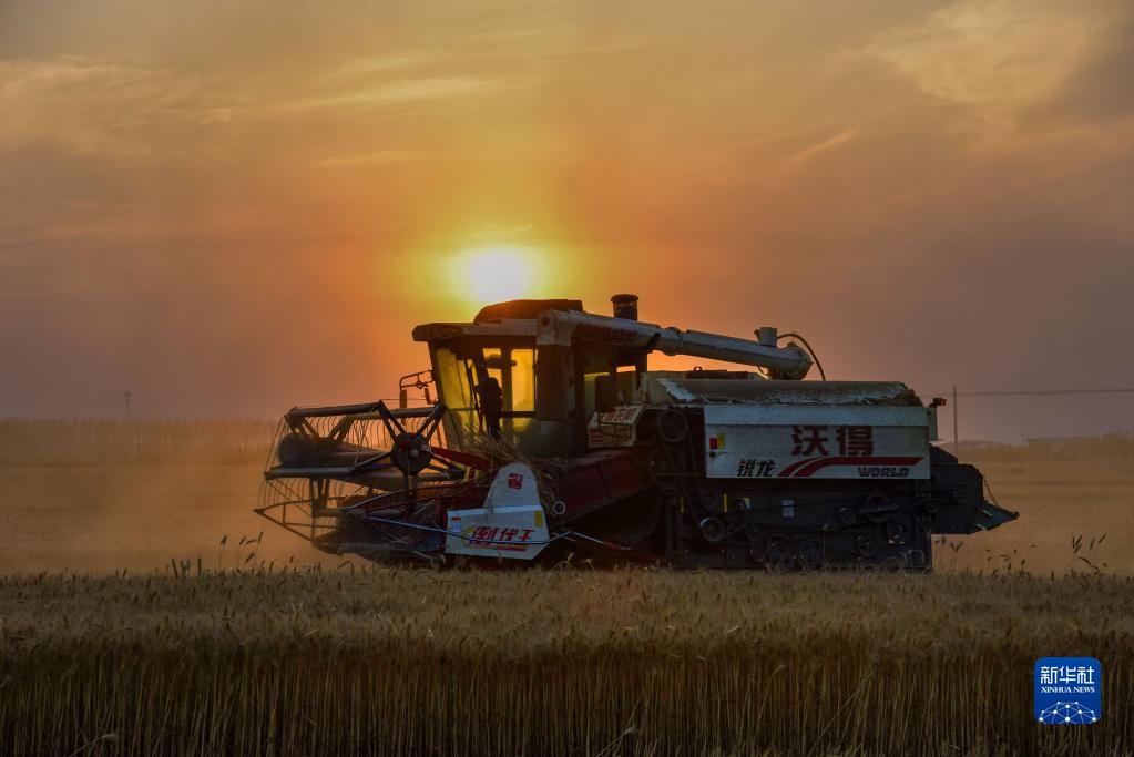 6月9日傍晚,收割機在安徽省宿州市碭山縣的麥田進(jìn)行搶收作業(yè)。
