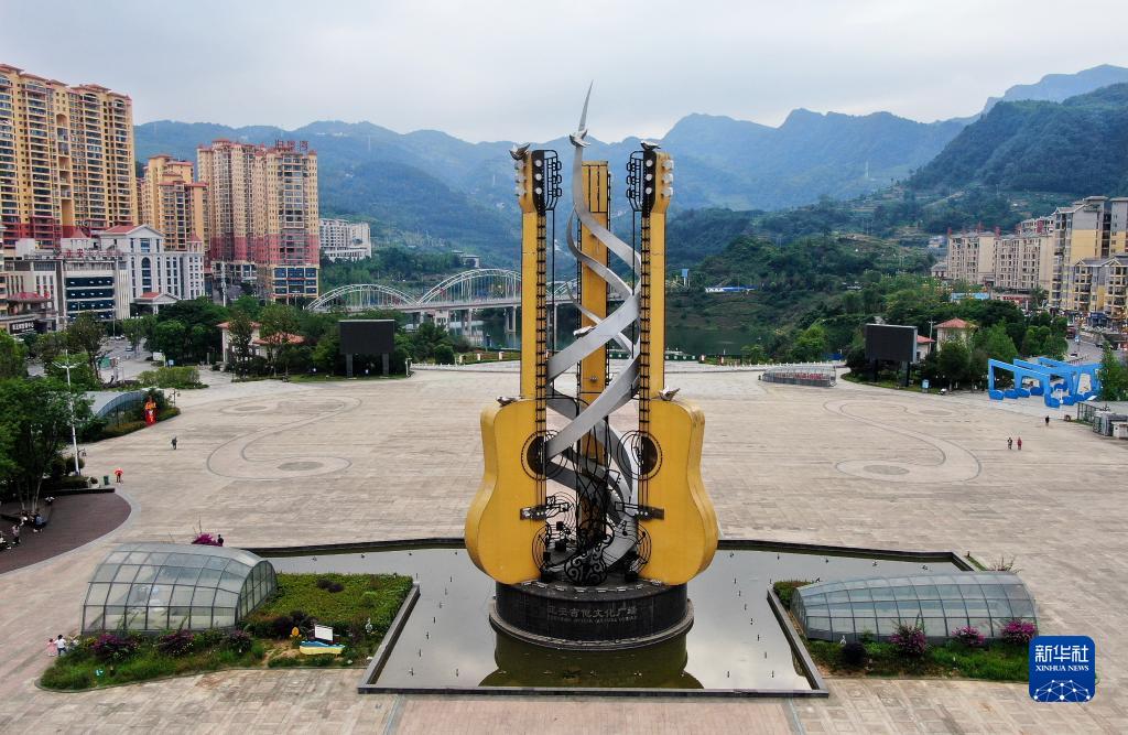 正安吉他廣場(chǎng)上豎立著(zhù)大型的吉他雕塑(6月7日攝)。