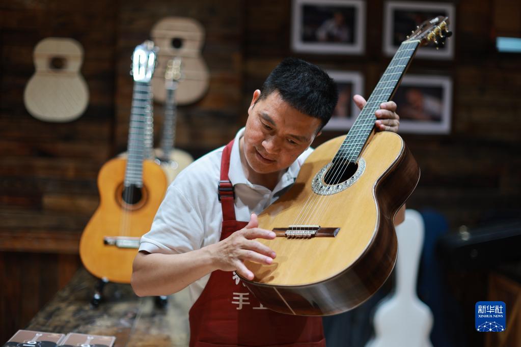 工作人員在正安吉他產(chǎn)業(yè)園內檢查已制成的吉他(6月7日攝)。