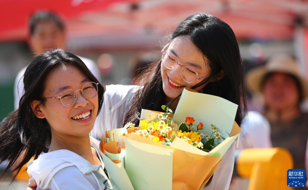 6月10日,在山東省滕州市第二中學(xué)考點(diǎn),一名考生(左)從朋友手中接過(guò)鮮花。