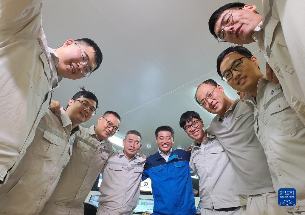6月11日,在深中通道海底隧道管節最終接頭合龍后,中交一航局深中項目測管中心負責人鎖旭宏(中)和團隊成員一起慶賀。