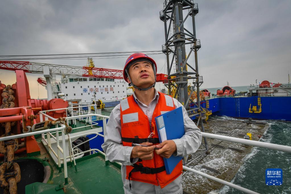 鎖旭宏在“一航津安1”號沉管運輸安裝一體船上檢查搭載的E16沉管上的測量裝備(2022年1月14日攝)。