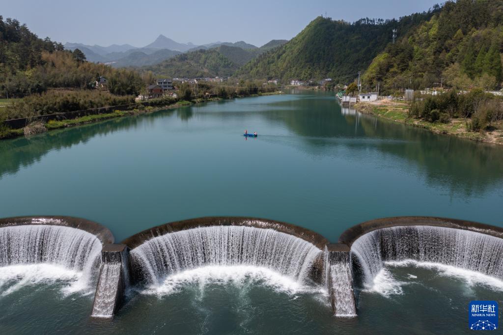 浙江杭州市臨安區昌化鎮黨員巡河護水志愿者乘船對昌化溪進(jìn)行日常河道保潔及巡查(2022年4月7日攝)。