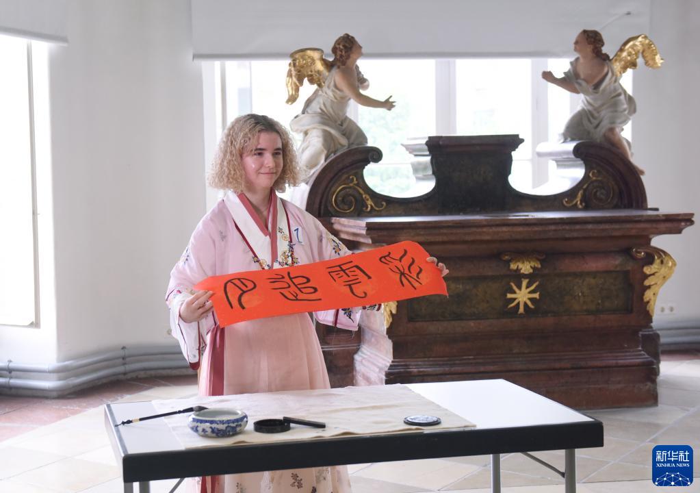 6月10日,在奧地利維也納大學(xué),選手漢娜·熱姆利奇在才藝表演環(huán)節展示書(shū)法作品。