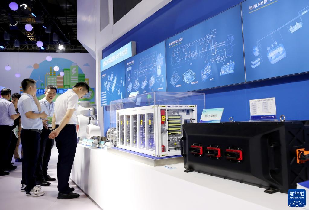 6月11日,參觀(guān)者在一組船舶低碳/零碳燃料動(dòng)力系統模型前交流討論。
