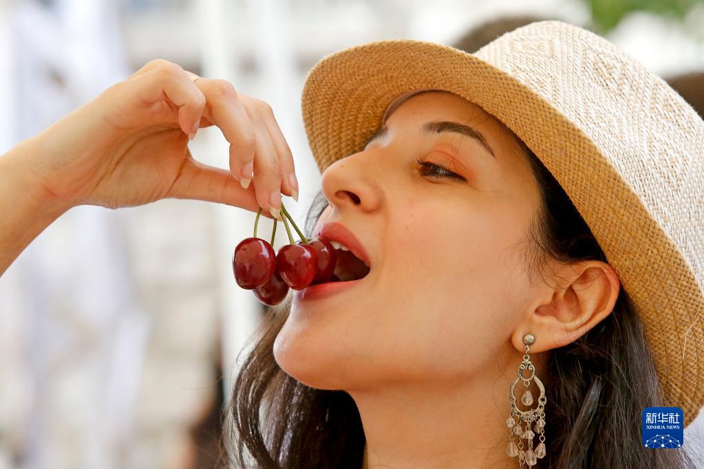 6月11日,一名女子在黎巴嫩哈馬納舉辦的櫻桃節上品嘗櫻桃。