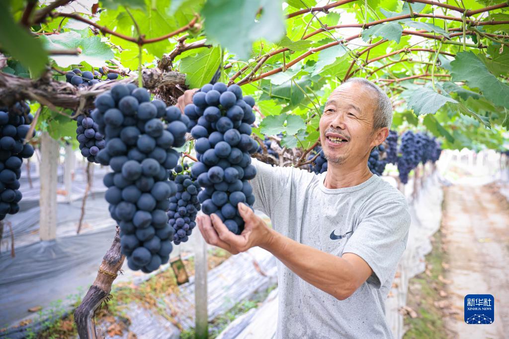 村民在浙江寧波江北區曙波果蔬農場(chǎng)的葡萄大棚內采摘成熟的葡萄(6月8日攝)。近年來(lái),江北區大力發(fā)展區域特色農業(yè),促進(jìn)鄉村農旅融合發(fā)展。
