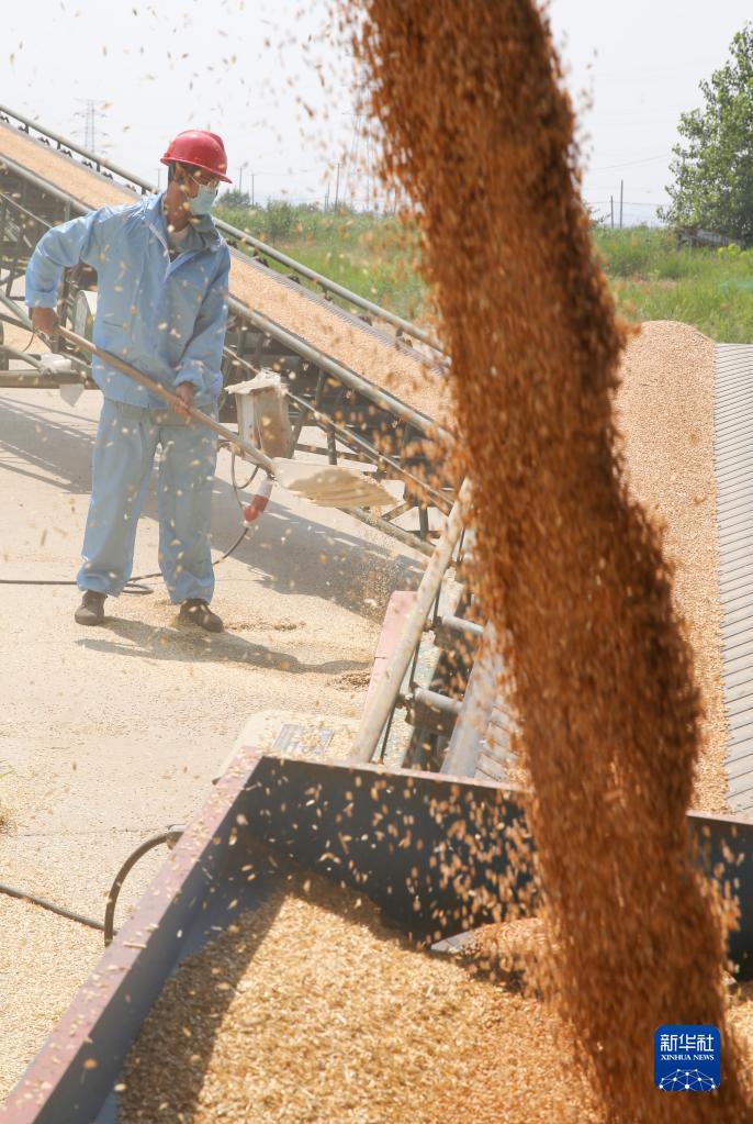 6月13日,在江蘇連云港市青口鹽場(chǎng)倉儲中心,工人用傳輸機傳送烘干后的小麥入庫。