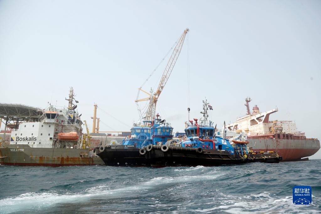 這是6月12日在也門(mén)荷臺達附近海域拍攝的聯(lián)合國工程船和“薩菲爾”號油輪。