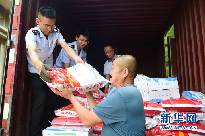 6月13日,黨建聯(lián)建活動(dòng)上稅務(wù)人員與企業(yè)員工為農民送去生物飼料。新華網(wǎng)發(fā)(常征 攝)