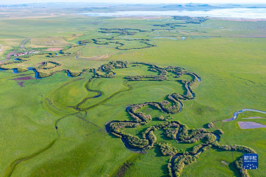 初夏時(shí)節,位于內蒙古自治區錫林郭勒盟東北部的烏拉蓋草原風(fēng)景宜人,蔚藍色的天幕下,綠色的草原廣闊無(wú)垠,蜿蜒流淌的烏拉蓋河綿延向遠方,美如畫(huà)卷。