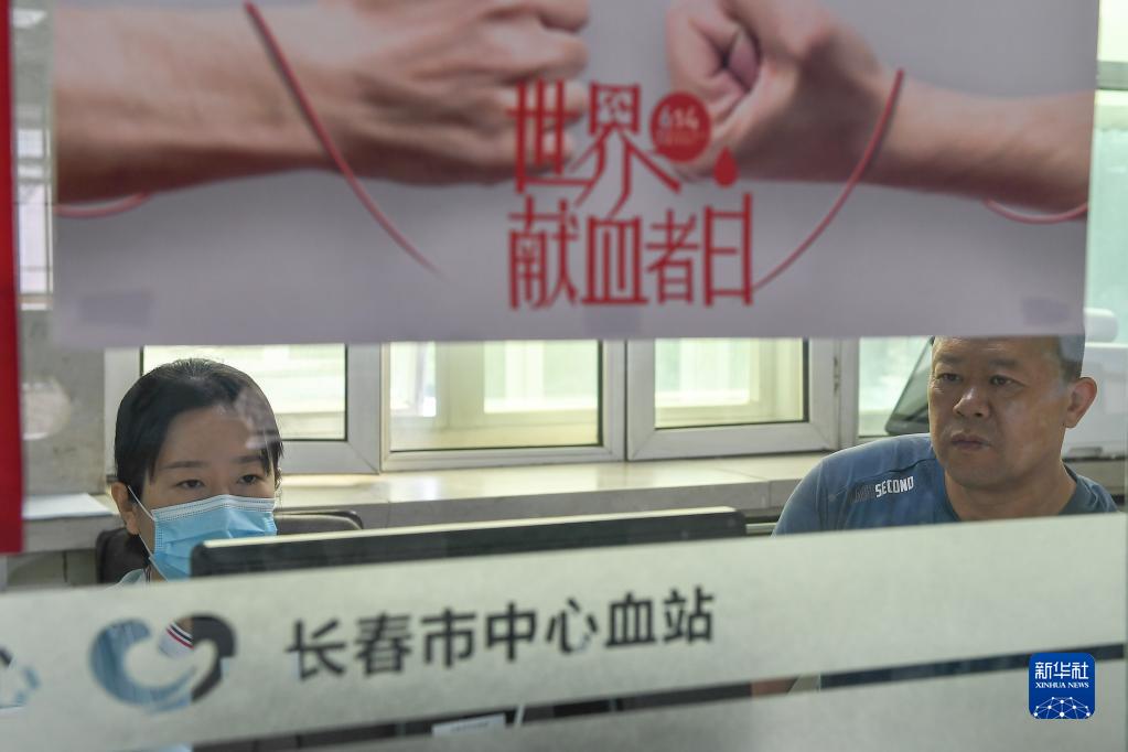 6月13日,在長(cháng)春市中心血站,RH陰性血無(wú)償獻血志愿者王文東(右)在獻血前檢查身體。