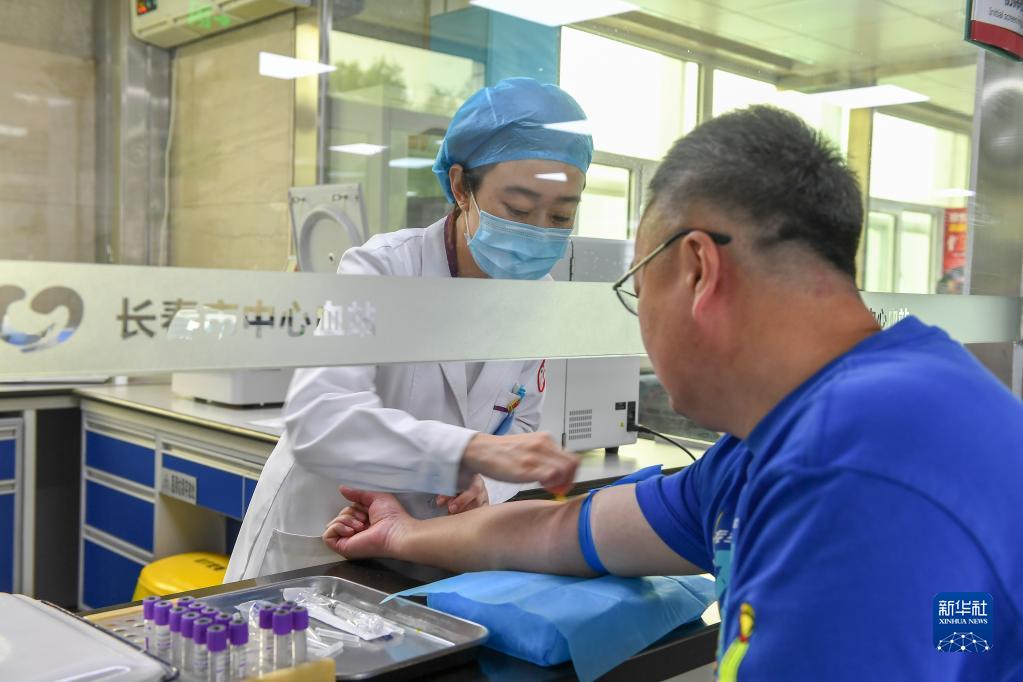 6月13日,在長(cháng)春市中心血站,RH陰性血無(wú)償獻血志愿者李揚帆(右)進(jìn)行獻血前的血液檢測。